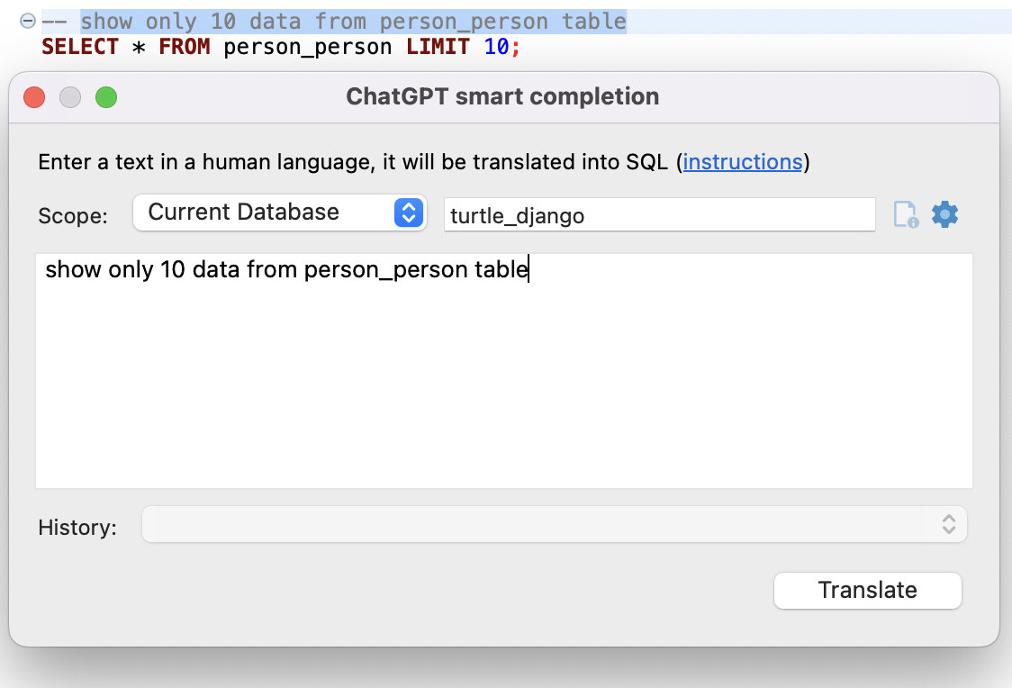 여기에 ChatGPT 채팅에 치던 것처럼 똑같이 입력해주면 SQL문으로 번역하여 SQL 스크립트에 나오게 된다.